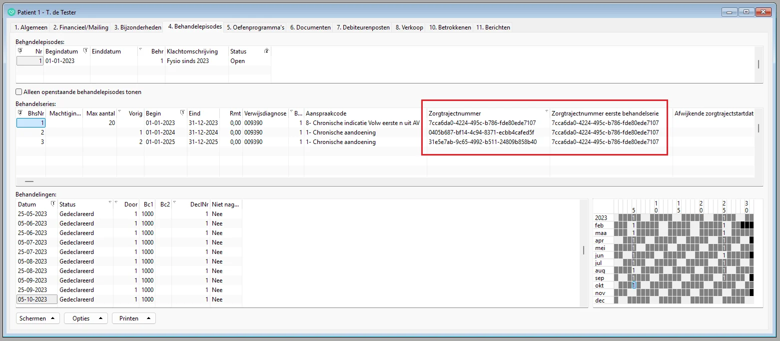 Het Zorgtrajectnummer kan alleen worden aangepast als deze nog niet voorkomt in de database, deze nummers dienen namelijk uniek te zijn. In onderstaand voorbeeld zie je dat deze patiënt 3 behandelseries die alle 3 een vervolg van elkaar zijn. In de kolom ‘Zorgtrajectnummer eerste behandelserie’ is te zien dat het nummer van de eerste serie voor alle 3 de series wordt gebruikt.