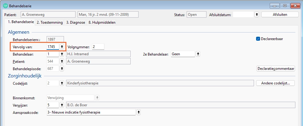 - Dubbelklik opnieuw op de behandelserie en vul het veld “Vervolg van” in met het nummer wat hier eerder stond. Sla hierna de serie op.