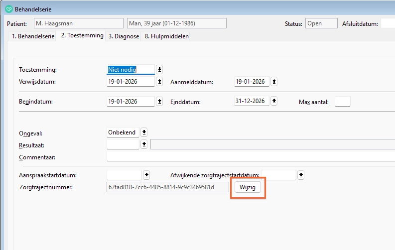 In een behandelserie op tabblad ‘2. Toestemming’ is het zorgtrajectnummer te zien. Klik op de knop ‘wijzig’ om deze te wijzigen.