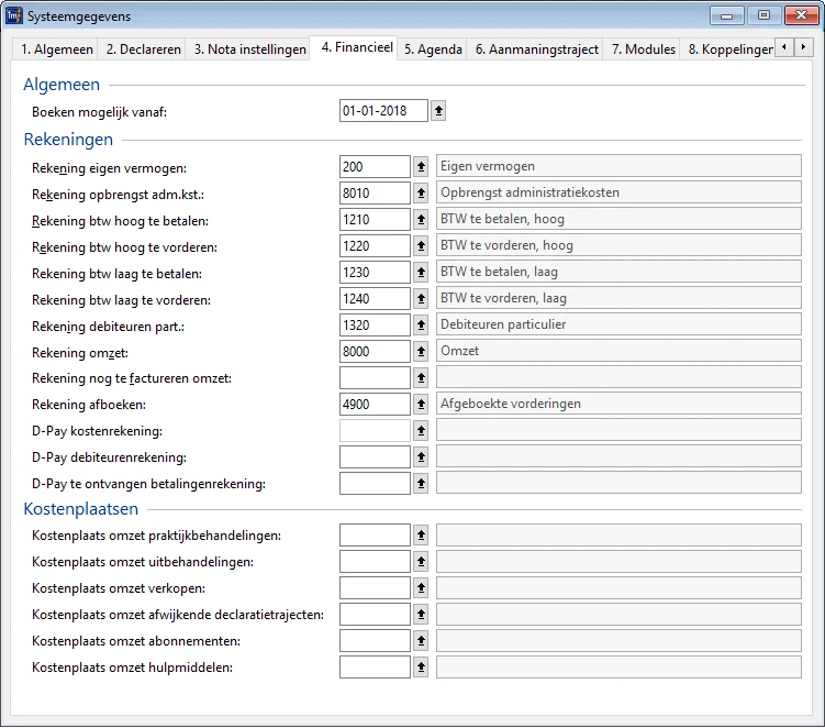 Op diverse plaatsen van het programma zijn standaard al een aantal grootboekrekeningnummers ingevuld omdat van die nummers op bepaalde momenten (zoals declareren en crediteren) gebruik wordt gemaakt. Als deze grootboekrekeningnummers niet zijn ingevuld dan kun je bepaalde handelingen zoals declareren en crediteren, niet uitvoeren. Daarom vind je o deze pagina alle zaken die je moet controleren.