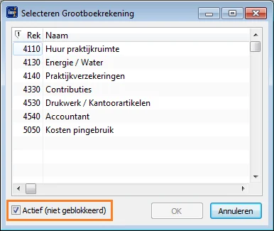 Let op: Het selectiescherm “Selecteren Grootboekrekening” wordt steeds gefilterd op rekeningnummers, die bij het type rekening beschikbaar zijn. Door onder in dit scherm het filter “actief (niet geblokkeerd)” aan te vinken, zie je alleen de beschikbare grootboekrekeningen.