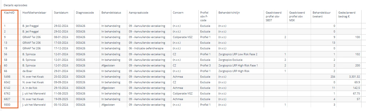 - Je ziet een lijst met behandelepisodes. Deze hebben een ‘KlachtID’ nummer.