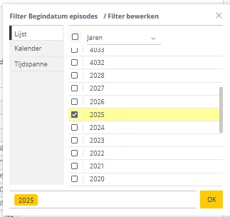 Je kunt één klacht tegelijkertijd inzien. Wil je de gegevens voor meerdere klachten? Dan kun je per klacht de onderstaande stappen herhalen. - Periode instellen: Bij het filter “Begindatum episodes” kun je de periode instellen.
