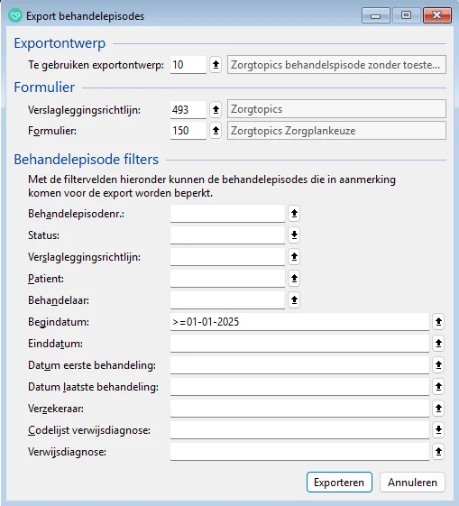 - Vul onder het kopje “Behandelepisodes filters” de begindatum in van de aan te leveren periode. Bijvoorbeeld Q1 2025: >=01-01-2025.