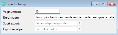 - Selecteer het veld ‘Te gebruiken export ontwerp de nieuwe gemaakte export “Zorgtopics behandelepisodes zonder toestemmingsregistratie”.