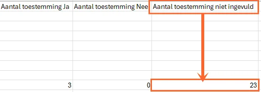 - Kijk naar de kolom ‘Aantal toestemming niet ingevuld’. Als hier een getal hoger dan 0 staat is er sprake van missende data omdat deze behandelepisodes NIET in de export zijn meegegaan. In onderstaand voorbeeld zijn er 23 toestemmingen niet ingevuld.