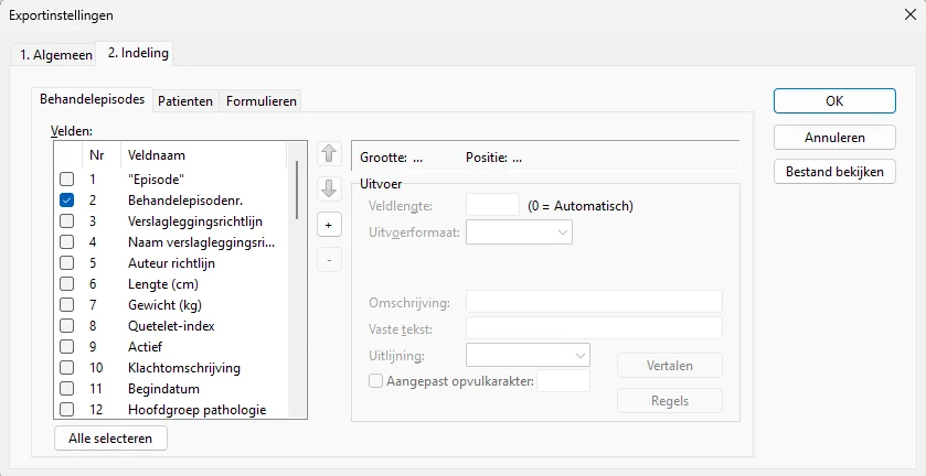 Nr Veldnaam 2 Behandelepisodenr. 29 Naam behandelaar 43 Naam behandelrichtlijn - Let erop dat alle andere velden niet aangevinkt zijn. Kijk ook op de andere tabbladen ‘Patiënten’ en ‘Formulieren’ of daar velden geselecteerd zijn.
