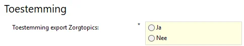 Om behandelepisodes te mogen versturen naar Zorgtopics is expliciet toestemming nodig van de patiënt. Dit is afgevangen via de Zorgtopics richtlijnen waar je de toestemming kunt registeren in het formulier ‘Zorgtopics zorgplankeuze’, onder het kopje ‘toestemming’