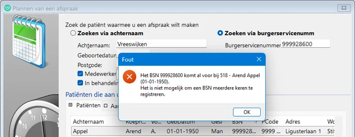 In de wizard ‘Plannen van een afspraak’ kwam de foutmelding dat je ingevoerde BSN al voorkwam, pas aan het einde. Voortaan zie je deze foutmelding al direct in het eerste scherm en kun je de gegevens niet opslaan: