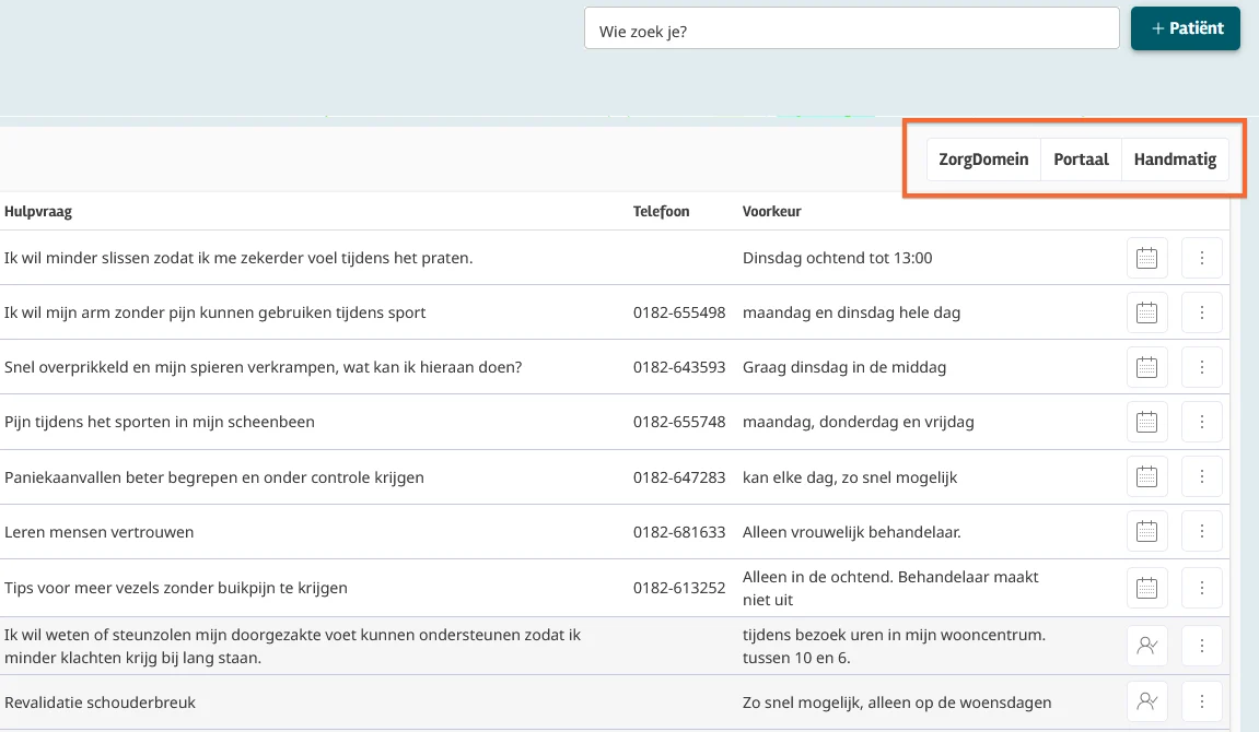 In het tabblad ‘Aangemeld’ kan vanaf nu worden gefilterd op aanmeldingen van ZorgDomein, Portaal of Handmatig. Je kunt 1 of meerdere filters hiervoor selecteren.