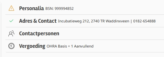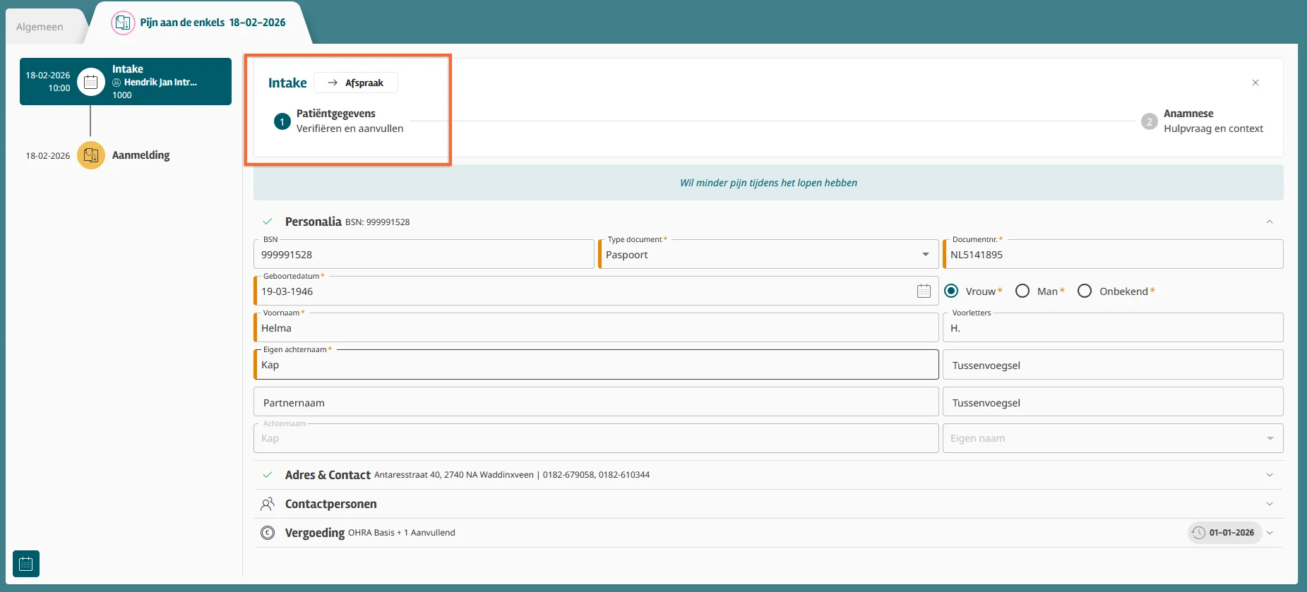 Tijdens de intake kun je de persoonsgegevens van de patiënt controleren of deze volledig zijn en bij terugkerende patiënten kun je checken of het adres, contactgegevens en contactpersoon nog kloppen. Ook kun je zien welke verzekeringen aanwezig zijn tijdens de intake. Voor elk onderdeel komt een vinkje of uitroepteken te staan als je een verplicht veld niet hebt ingevuld of de invoer niet valide is.