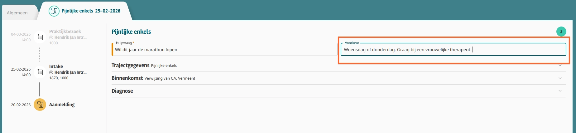 De hulpvraag van de patiënt staat vanaf nu boven de Intake in het Sessiejournaal. Tijdens het invullen kun je direct zien wat de patiënt wil bereiken met de behandeling.