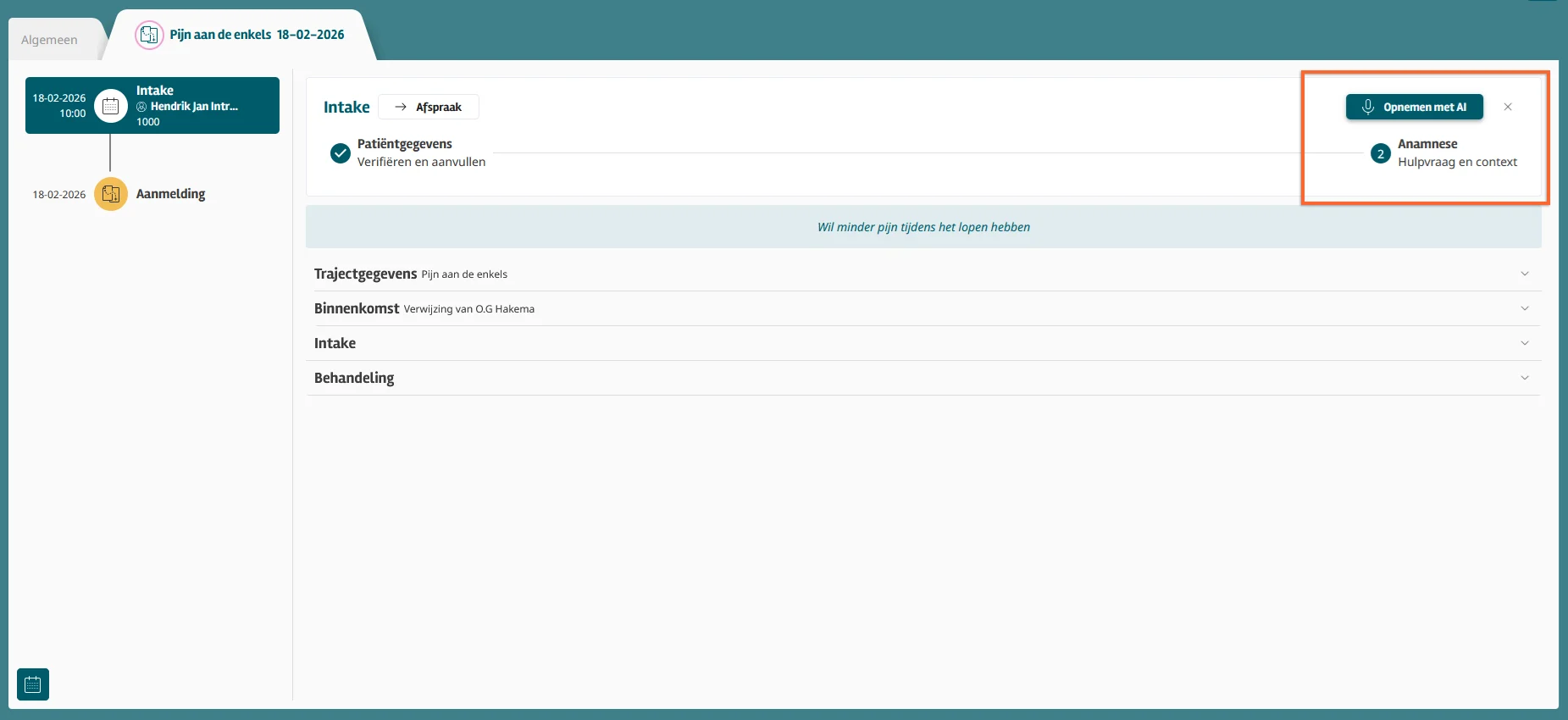 Bij stap 2 kun je de trajectgegevens verifiëren. Je kunt bijvoorbeeld de binnenkomst wijzigen als de patiënt tijdens de intake een verwijzing mee heeft. Het intakeformulier en/of de SOAP vindt je bij deze stap terug, en je kunt meteen de intake opnemen met AI.