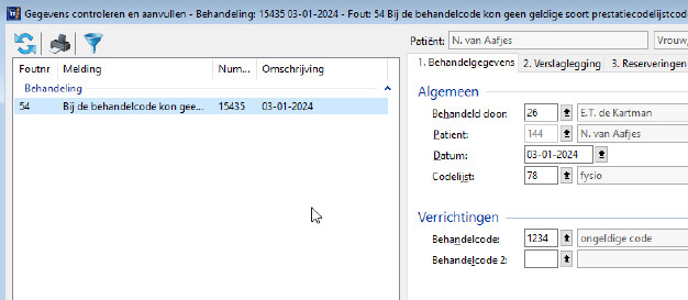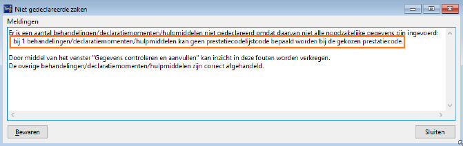 Als er een onbekende prestatiecode/behandelcode wordt gebruikt, kan er geen juiste prestatiecodelijstcode worden bepaald. Om afwijzingen van de declaratie te voorkomen, worden deze behandeling voortaan tijdens het declareren naar verzekeraars overgeslagen. En je ziet ook een foutmelding in het scherm ‘Niet gedeclareerde zaken’: