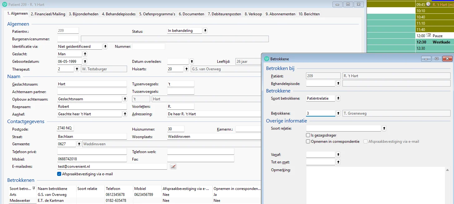 Vanaf nu zijn betrokkenen, zoals de ouders van kinderen, direct op het 1e tabblad van de patiënt te zien en in te voeren. Daarnaast zijn de relevante contactgegevens zoals telefoonnummer of e-mailadres zichtbaar in het rechter zijscherm wanneer je een behandeling in de agenda selecteert. Hierdoor heb je de contactgegevens direct bij de hand.