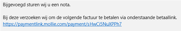 - Het is mogelijk om er zelf een boodschap bij te zetten zoals: “Via de volgende link kunt u gemakkelijk online betalen:” of “Bij deze verzoeken wij u om de volgende factuur te betalen via onderstaande betaallink.“ (gevolgd door een enter voor een nieuwe regel)