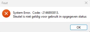 Ik krijg de melding “System Error. Code: -2146893813. Sleutel is niet geldig voor gebruik in opgegeven status”. Wat moet ik doen?