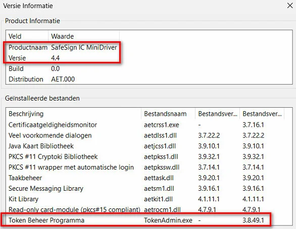 Om te controleren welke versie van Safesign gebruikt wordt gaat in het programma Token administratie naar Help -> versie informatie