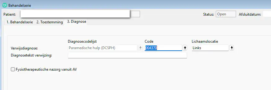 Er is daarom in behandelseries met de verwijsdiagnose ‘Paramedische hulp (DCSPH)’ op tabblad ‘3. Diagnose’ een extra veld in te vullen. Je vult dit veld alleen in bij ‘verplichte’ diagnoses.